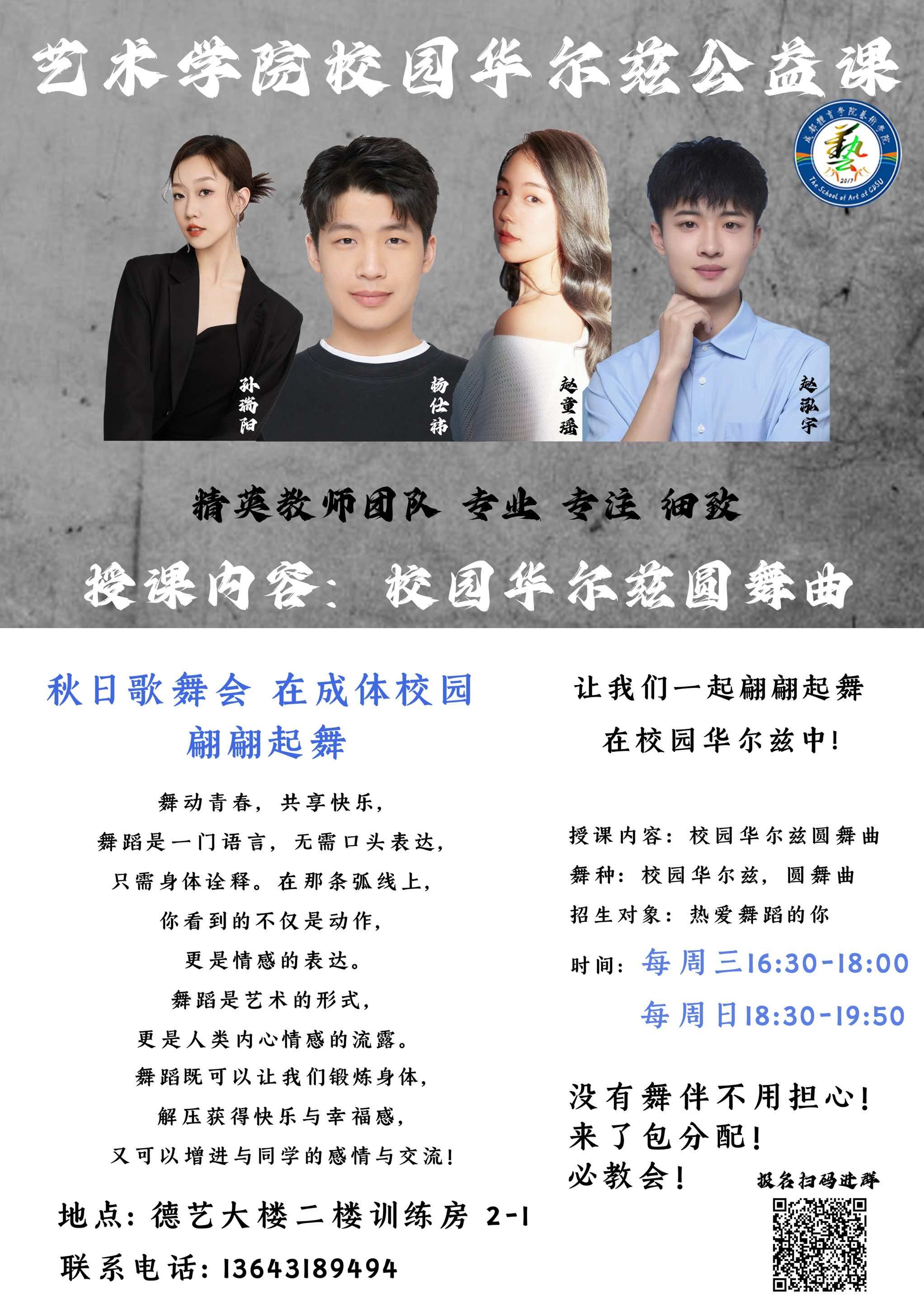 校园集体舞作为2024年校运会国际标准舞比赛特色项目,将在每周三16:30-18:00/周日18:30-19:50德艺大楼二楼训练房2-1开展国标舞赛前公益课,欢迎同学们踊跃参与。