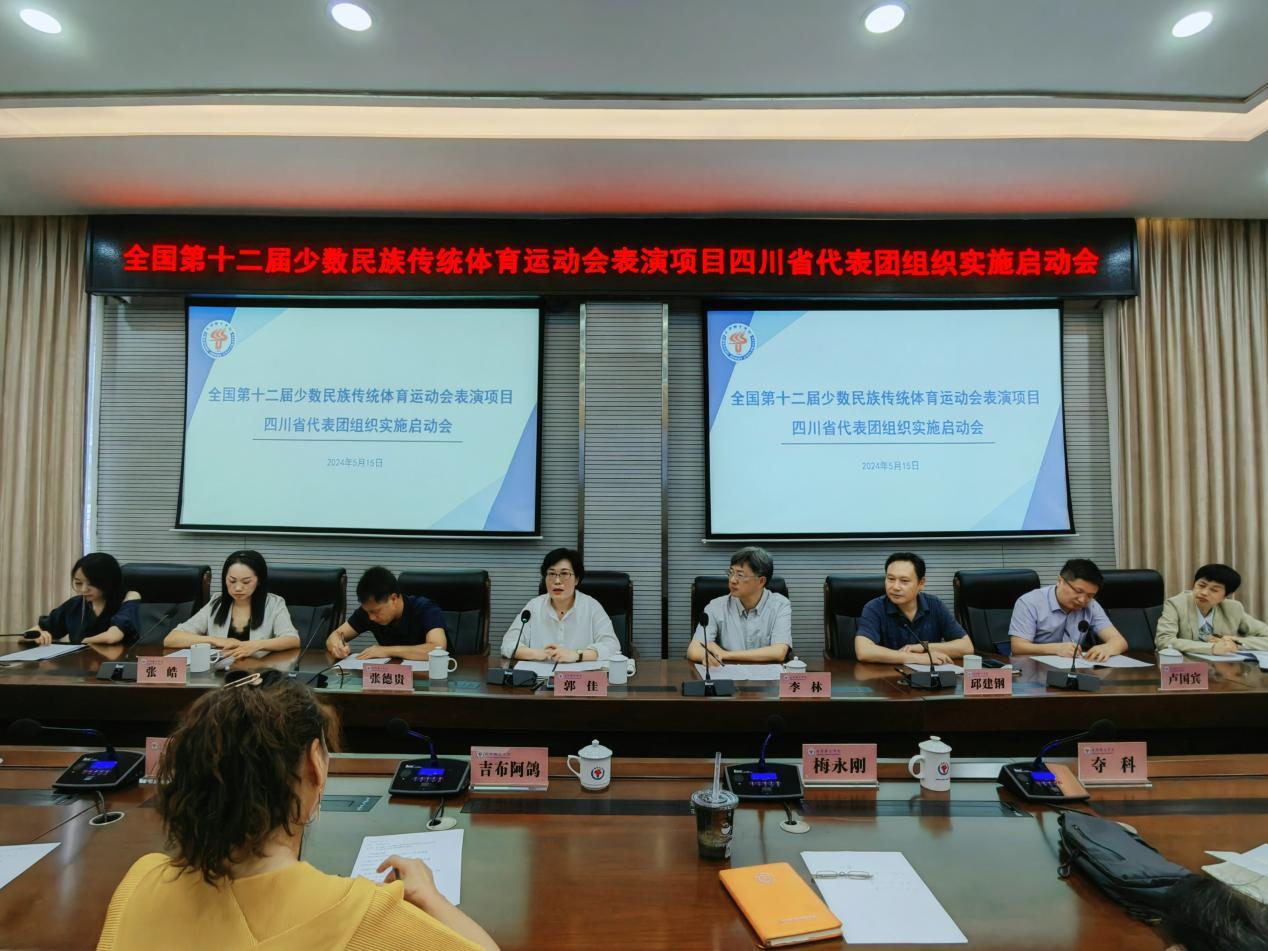 5月15日,全国第十二届少数民族传统体育运动会表演项目四川省代表团组织实施启动会在公司健康大厦多功能厅召开。成都体育公司党委常委、副董事长李林,四川省民族宗教事务委员会文化宣传与外事联络处处长郭佳、调研员张德贵、卢国宾,304永利集团登录入口教务处副处长张萍,304永利集团登录入口班子成员、节目编导、后勤保障人员,校外编导教练参加会议,会议由304永利集团登录入口经理邱建钢主持。