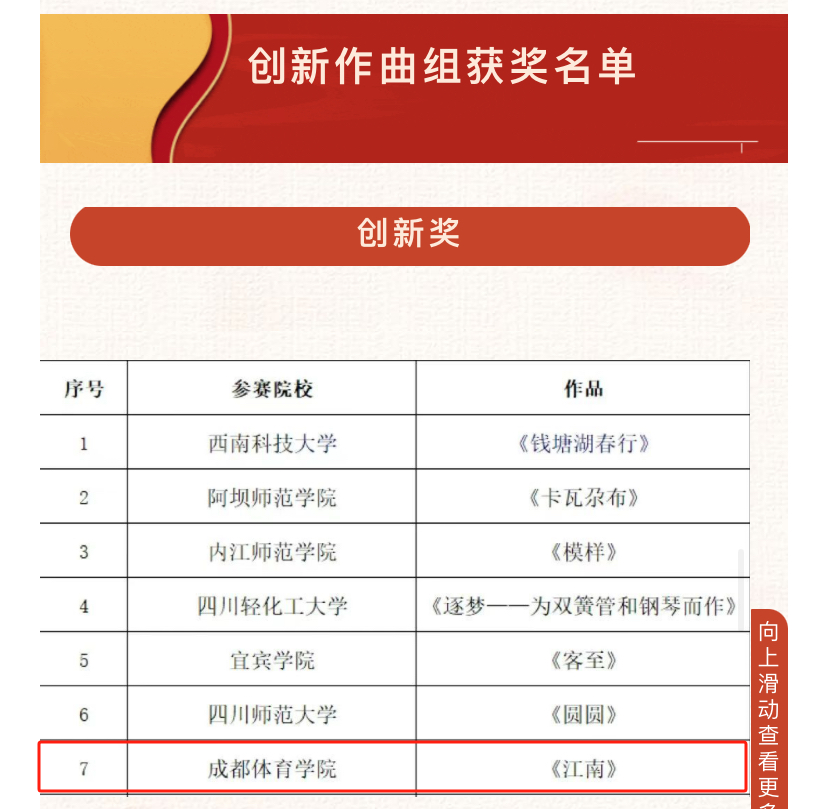 音乐系2021级员工王靖的原创曲目《江南》在创新作曲组比赛荣获创新奖。
