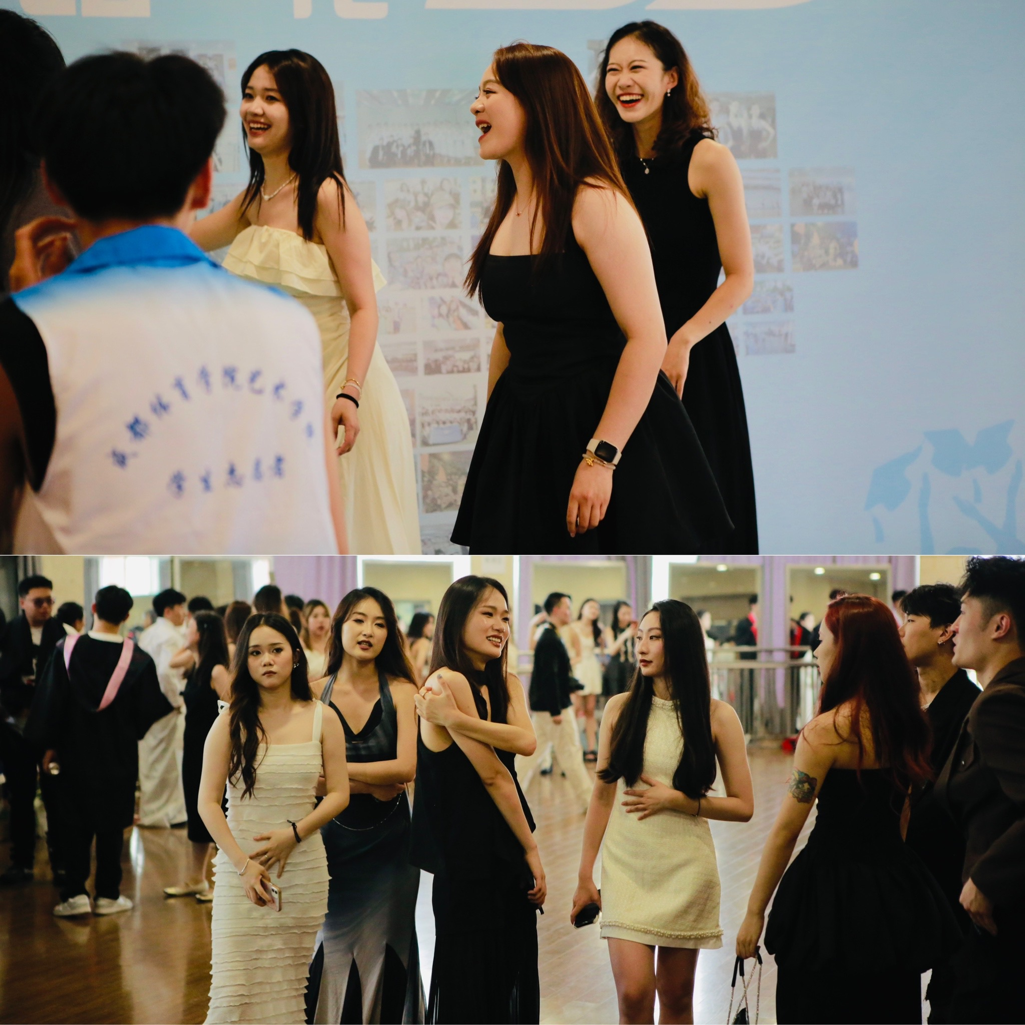 大学时光匆匆流逝,一转眼曾经青涩的面庞早已变得坚毅成熟了许多,曾经在建党100周年、建校80周年等各类舞台上精彩演绎的2024届毕业生们也即将离校奔赴祖国各地。因此在庄重的授位仪式开始前,在毕业生们曾经日夜排练的舞蹈房中,公司举办了一场别开生面的毕业舞会,毕业生们纷纷盛装出席,在签名墙前合影留念,为自己在老员工涯中跳起最后一支华丽的圆舞曲。