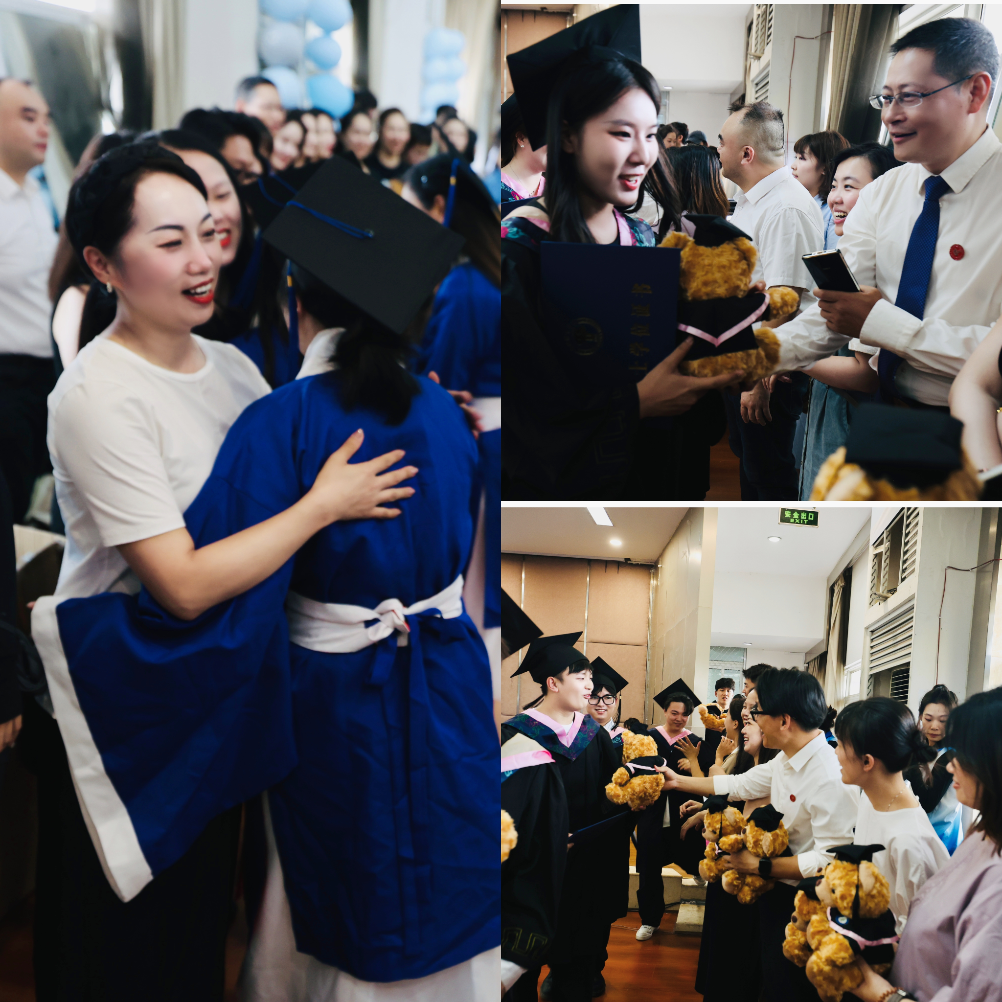 台上“拨穗、正冠”,台下温情拥抱、祝福,公司教师纷纷为2024届毕业生们赠送毕业礼物。一次次握手、一次次拥抱、一次次合影留念,时光总是走得太快,老师们还记得毕业生们在课堂在舞台上的点点滴滴,员工们也仍对老师们的谆谆教诲记忆犹新,然离别的时刻已悄然来到,满腔情感终化为满满的祝福,依依惜别、再道珍重!